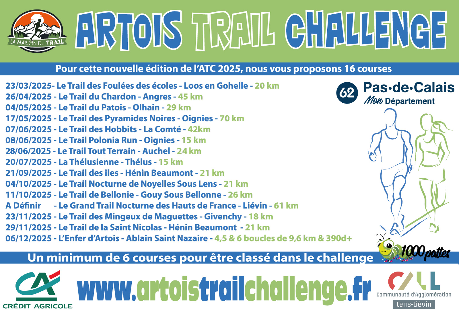 - Les Galibots - 8 kms - 8€ - Une belle balade, direction le terril de Pinchonvalle avec un retour vers Givenchy en Gohelle, Angres , et retour pour le Stade couvert ou une surprise finale vous attendra avant de franchir la ligne d’Arrivée. Un beau parcours en perspective pour une découverte du Trail.