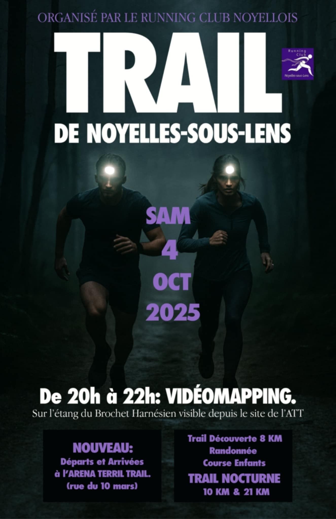 La dixième édition du trail Nocturne de Noyelles sous Lens aura lieu le 04 octobre 2025 et proposera une course enfants, un 8km - Trail découverte, Deux trails nocturne: un 10 km, un 21 km - ATC 2025 et une randonnée de 8 km.